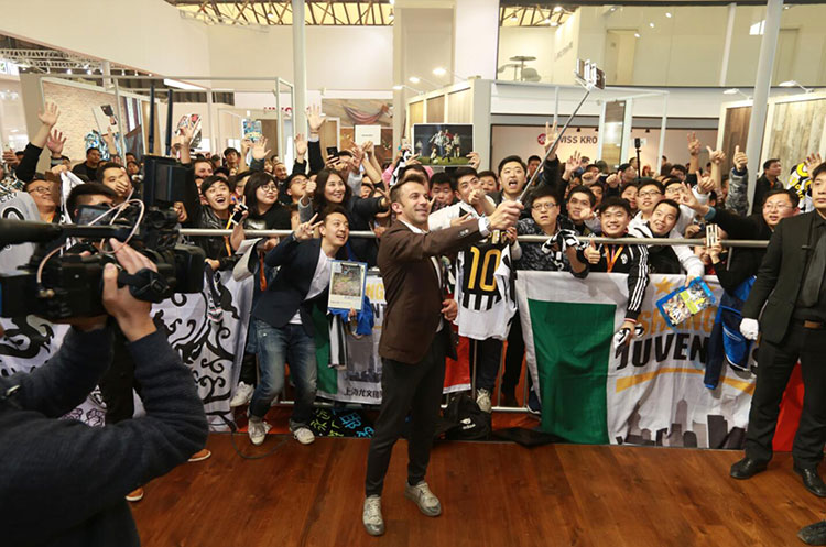 下午,E1館A01必美地板展廳,球迷見面會在全場高唱尤文圖斯隊歌時正式開始!皮耶羅一身颯爽英姿,帥氣地與球迷問好!