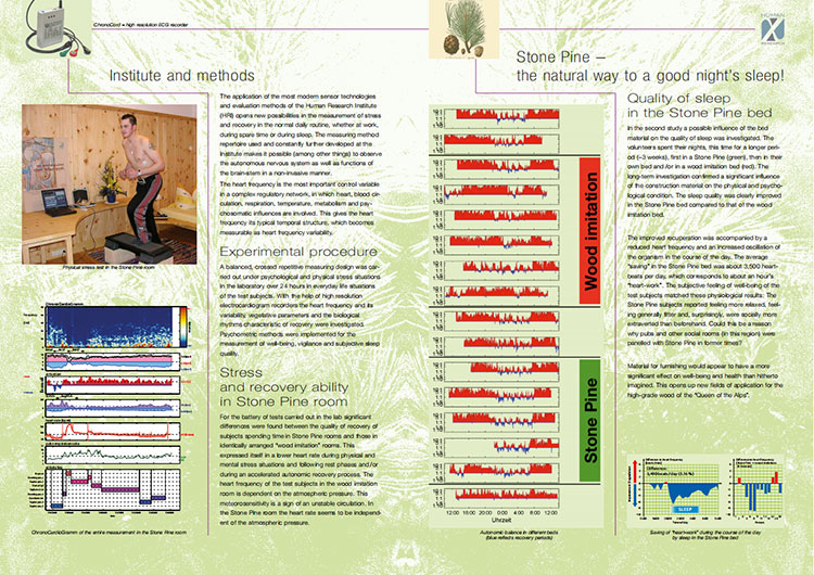 在實(shí)驗(yàn)室進(jìn)行的一系列測(cè)試顯示,在同樣布置的石松木房間和“仿木”房間中,受試者的恢復(fù)質(zhì)量存在顯著差異。在身體和精神緊張的情況下以及隨后的休息階段,以及在加速的自主恢復(fù)過(guò)程中,石松木房間的受試者表現(xiàn)為較低的心率。隨后的縱向研究證實(shí)了家具材料對(duì)身體和精神狀態(tài)存在顯著影響,石松床的睡眠質(zhì)量明顯優(yōu)于仿木床。