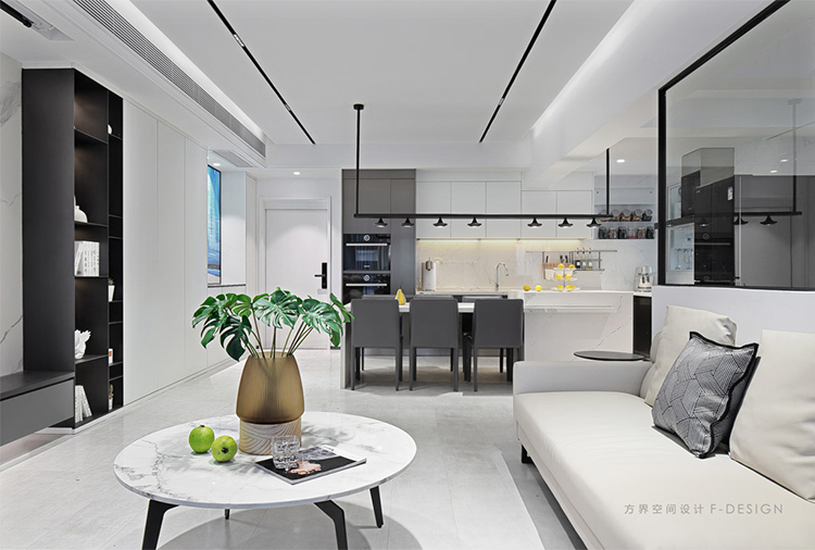 我們在天花設計時盡可能的讓空間高上去,包括電視上方的空調機位我們也放了個投影儀的功能進來,業主二人在快節奏的工作休閑之余,可以放音樂看電影。磁吸燈的運用在空間線條的運用也為我們的現代風格加分不少。