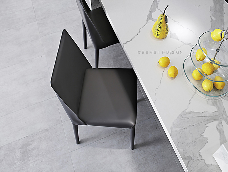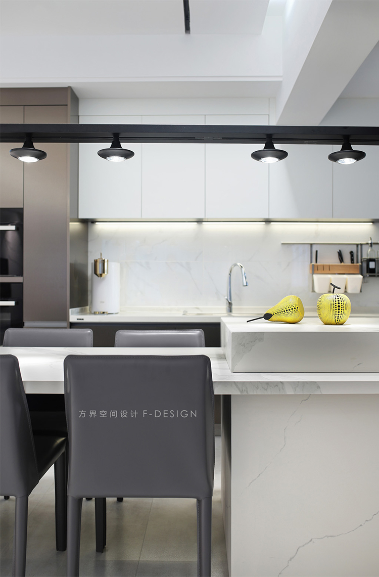 餐廳空間是日常生活的重心之地也是體現家的氛圍之處。開放式廚房最重要的是擁有一個島臺,簡單大氣的巖板餐臺也延續了客廳的,配上舒適的餐椅,搭配吊燈,開燈的瞬間溫暖整個空間。