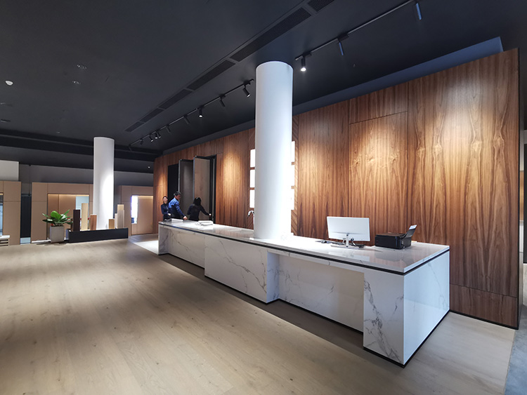 三面縱向墻體將主題空間規整起來,更好地體現出空間效果。橫向的長條形臺階使得原先的落差得以有效過渡,且可以兼顧地板展示及綠植擺放,使得整體空間變得大氣開敞。