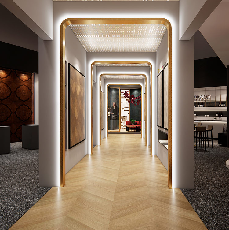 今年必美地板展廳采用全新升級的視覺系統(tǒng),中英文結合更加凸顯必美歐洲原裝進口品牌的奢華魅力。從內到外,從裝置到互動,從光影到氣韻,一條沉浸式的“時光隧道”吸引觀者深入探索必美更深層次的美,勢必會成為設計周的網(wǎng)紅打卡圣地!