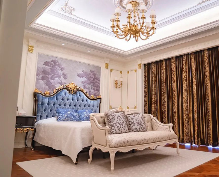 主臥的必美菲列德羅巴多利諾拼花地板,花色靈感來自意大利Bardolino高級葡萄酒,置身于此,給人一種如同品酒般香醇絲滑的體驗和感受。家具和吊燈都帶著金色雕花,奢華感十足;床頭背景墻則采用軟包,渲染出舒適而安逸的家居氛圍。