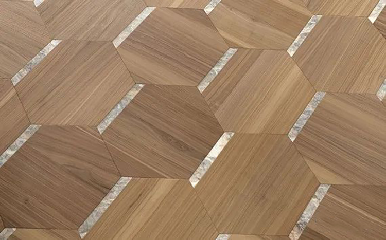 Alveo (阿爾維奧)創意靈感充斥在自然界當中,基于數字“6”的幾何圖案在自然界比比皆是,如蜂巢、巖石、水生生物的骨骼和昆蟲的眼睛,這是因為六邊形是平衡表面和等效體積最有效的結構。Alveo模塊所贊揚自然結構的美感,Alveo選用名貴的木材與不同的飾面材料鑲嵌物交替搭配使用,以六邊形元素為基礎進行可塑性的延續,在腳下還原大自然的絕色美感。