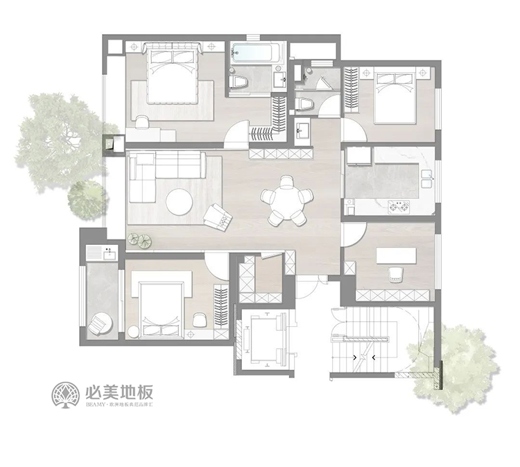 原木與極簡白色階之間的和諧融合,展現(xiàn)了空間的寧靜與包容性。必美史迪萊克單拼圣保羅橡木,原木色系地板,讓居者回歸大自然,在睡夢中遠離喧囂,感悟內心的純凈和生活的真諦。