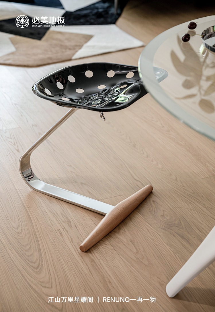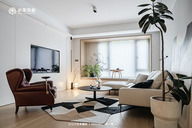純白墻面上線條的縱橫交錯運用,可以讓原本扁平無趣的空間變得立體飽滿,搭配地面的必美史迪萊克單拼圣保羅橡木地板,無結疤蟲結,能夠展現(xiàn)自然恬靜、清新脫俗的自然之美,營造客廳輕松舒適的氛圍。