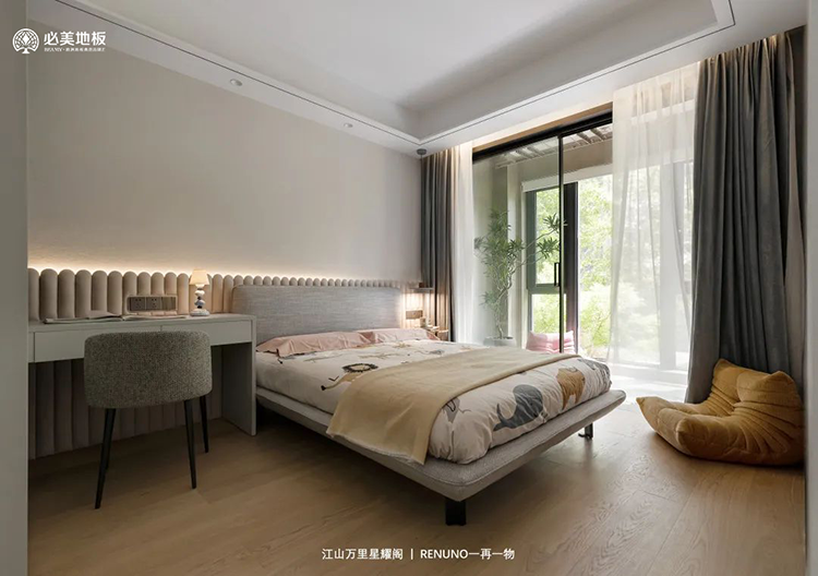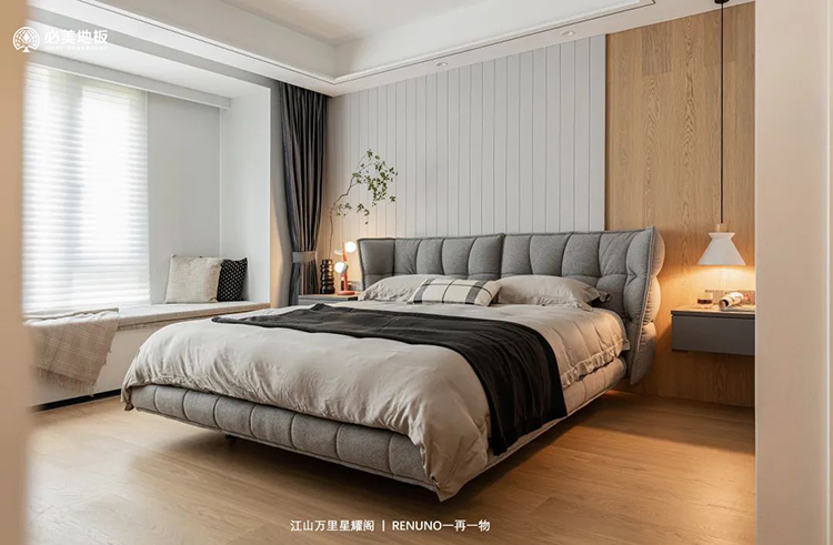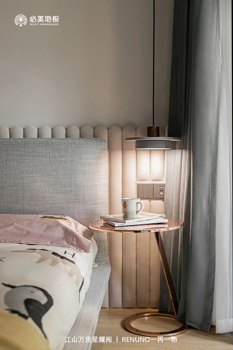 床后的半腰護墻板,暗藏裝飾燈帶,巧用燈光營造溫馨精致的氛圍;與酷似籬笆的造型,與必美史迪萊克單拼圣保羅橡木地板搭配,烘托出休憩空間中的舒適、自然屬性。