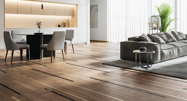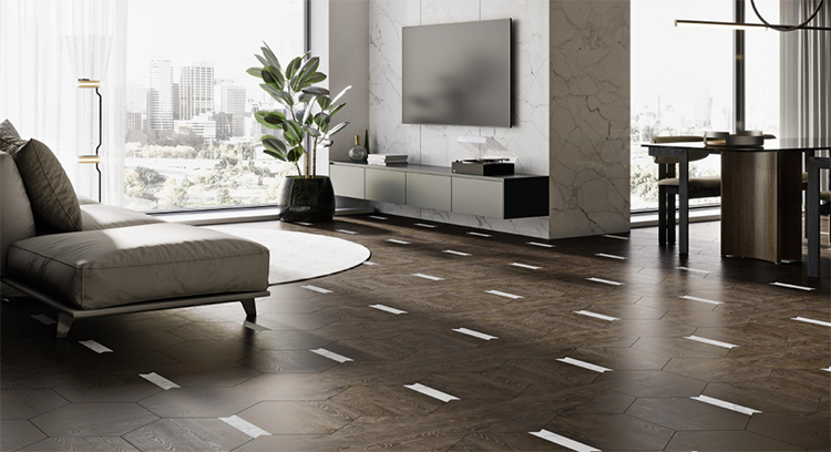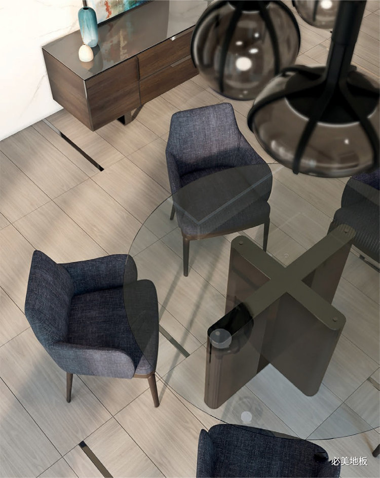在這些基礎之上,其他的幾款地板是通過木地板與金屬、與大理石等一些材料拼接而成的,這種工藝做法也是非常吸引我的一個地方,因為當我們去思考一個家里,一個空間的地面的時候,我們如果希望他有不同的風格不同的情緒出現在里面的時候,可以把不同的材料進行融入拼接,這是一個非常好的處理手法,而這次的愛麗蒙塔系列地板,就把這樣的手法進行非常好的詮釋。