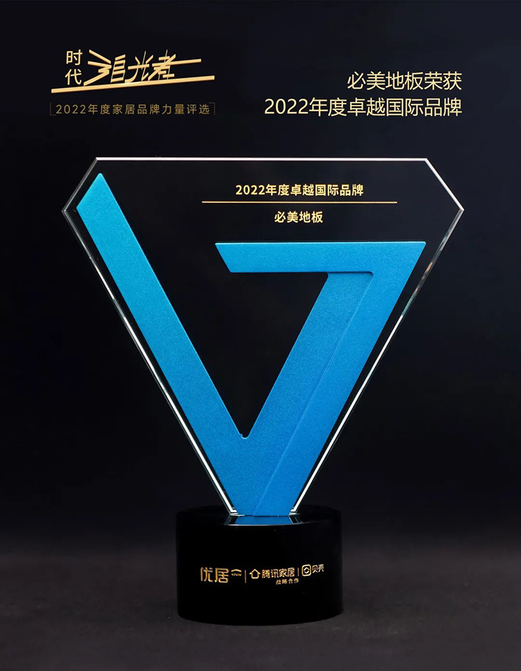 由騰訊家居·貝殼、優居主辦的“時代追光者”——2022年度家居品牌力量評選頒獎直播盛典載光盛啟,必美地板憑借強勁的綜合實力,在眾多優秀品牌中脫穎而出,榮獲“2022年度卓越國際品牌”。