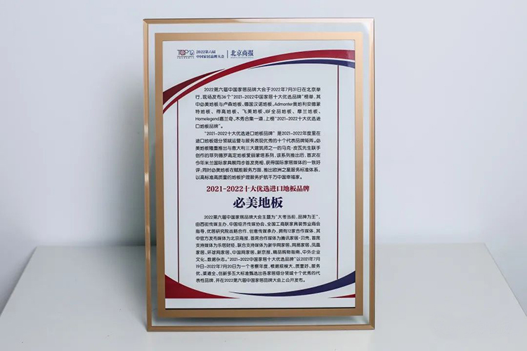 7月31日,由北京商報社、西街傳媒主辦的2022第六屆中國家居品牌大會上,現場發布36個“2021-2022中國家居十大優選品牌”榜單,其中必美地板上榜“2021-2022十大優選進口地板品牌”