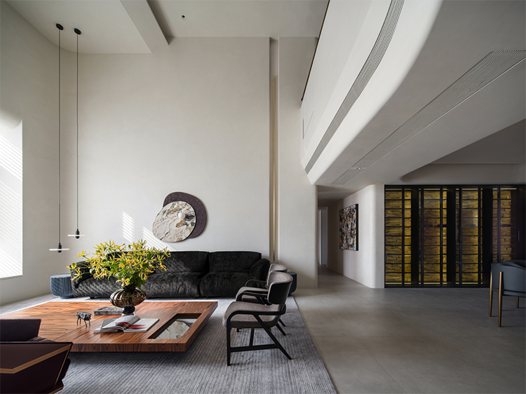 連接一、二層的挑高空間,以簡潔開放的格局,通過空間水平垂直度量的分層、遞進與穿插,營造輕盈自在、寧靜舒適的空間氣氛。