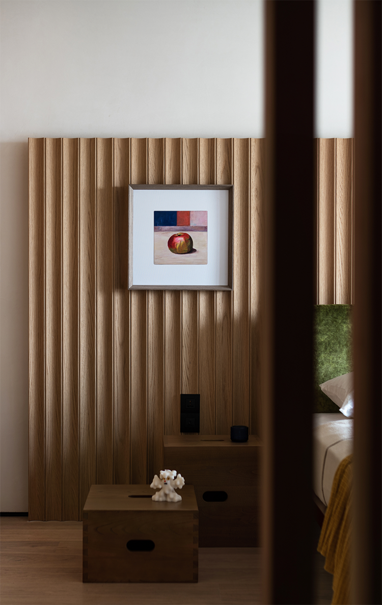 透過格柵屏風引入的自然光線,在房間里長出溫潤的影子。被阻隔的光線在空間的一處形成光的韻律篇幅,溫暖的色彩點綴著臥室空間,與溫潤的木色相得益彰。