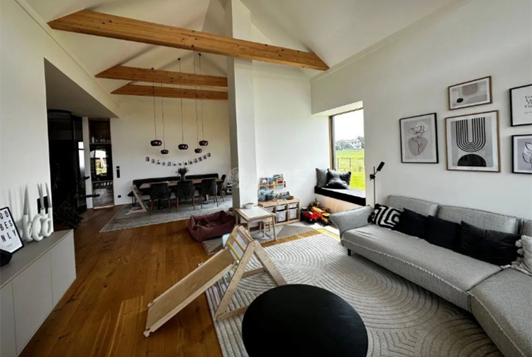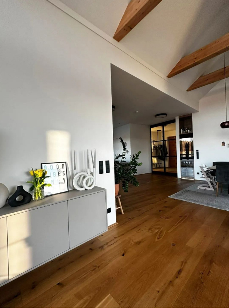 我們的WOODflor NOVOLOC 5G 222 Oak Country Seda Natura花色,通過(guò)最長(zhǎng)的板材規(guī)格展現(xiàn)出自己,它對(duì)這個(gè)約160平方米的生活空間的室內(nèi)氣候產(chǎn)生了積極影響。除了浴室和廁所等潮濕區(qū)域外,所有房間都使用了橡木實(shí)木復(fù)合地板,包括前廳和廚房。