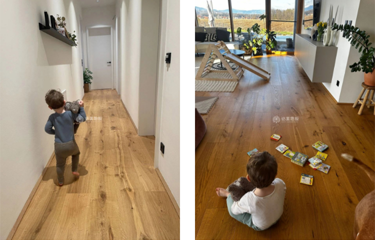 出于這些原因,實(shí)木復(fù)合地板的光學(xué)效果不僅必須符合要求,還需要堅(jiān)固耐用,提供了健康的室內(nèi)氣候,并且提供維修修復(fù)保障。因此,這個(gè)年輕的家庭選擇實(shí)木復(fù)合地板不僅是因?yàn)樗麄兙薮蟮南鹉韭涞卮埃€因?yàn)樵摦a(chǎn)品的生物和技術(shù)特性。