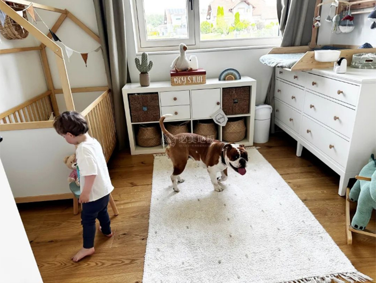 Verena和Lukas圍繞著兒子Vincent和他的小狗Ylvie,大部分時(shí)間都在專門為他設(shè)計(jì)的游戲角里。赤腳奔跑對(duì)孩子們來(lái)說(shuō)非常重要,在拉絲的精雕面實(shí)木復(fù)合地板上更添趣味。