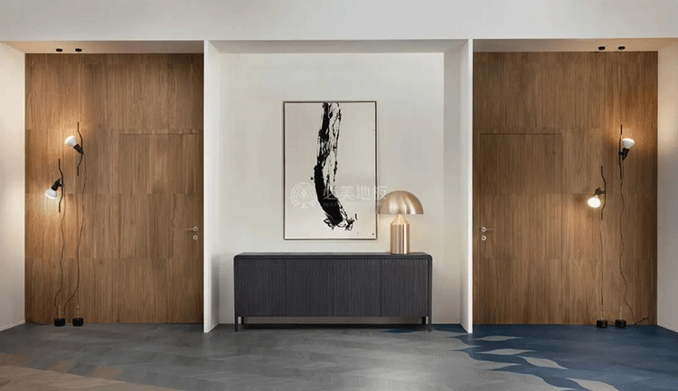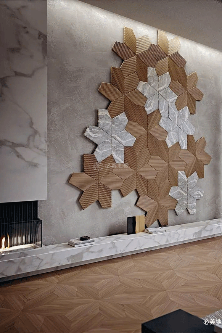 必美菲列德羅阿扎利亞的3D藝術(shù)護(hù)墻板以經(jīng)典的花瓣型拼貼方式,結(jié)合木頭與大理石/金屬條等材料元素產(chǎn)生奇妙的碰撞,全屋定制的品味與檔次,讓空間里的每個(gè)角落都充滿自然藝術(shù)的高級(jí)質(zhì)感。