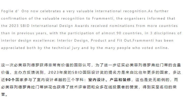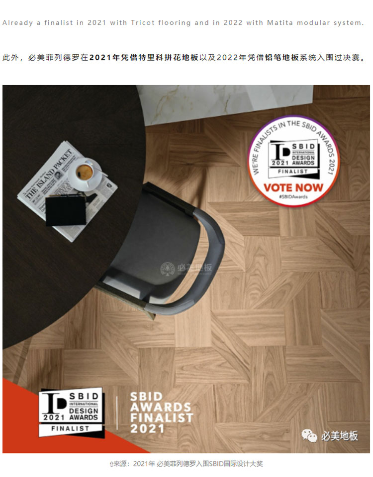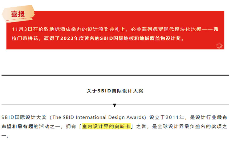 喜訊 | 必美菲列德羅弗拉門蒂拼花地板榮獲2023年度SBID國際設計大獎