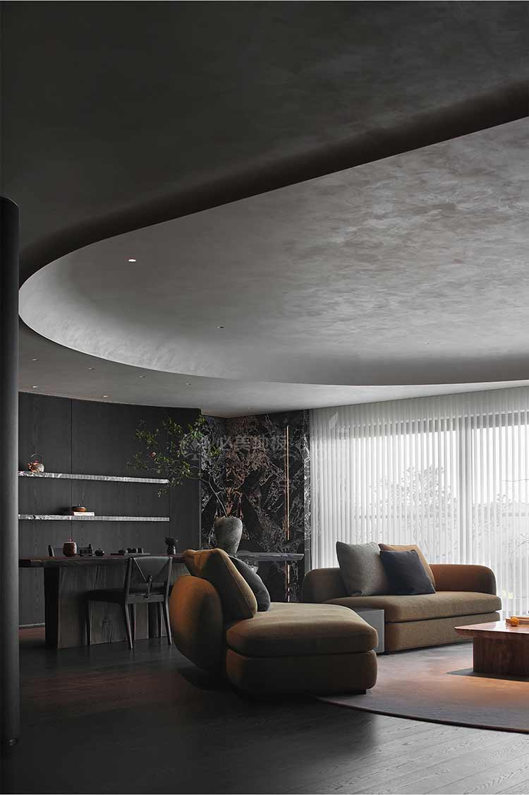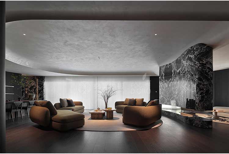 全屋設(shè)計以“隱于形的詩意”為核心,通過精心策劃,打破了線性空間的固有邏輯,于蜿蜒的曲線形態(tài)與深色空間畫布中,締造出明朗大氣、優(yōu)雅靜謐的氛圍感。