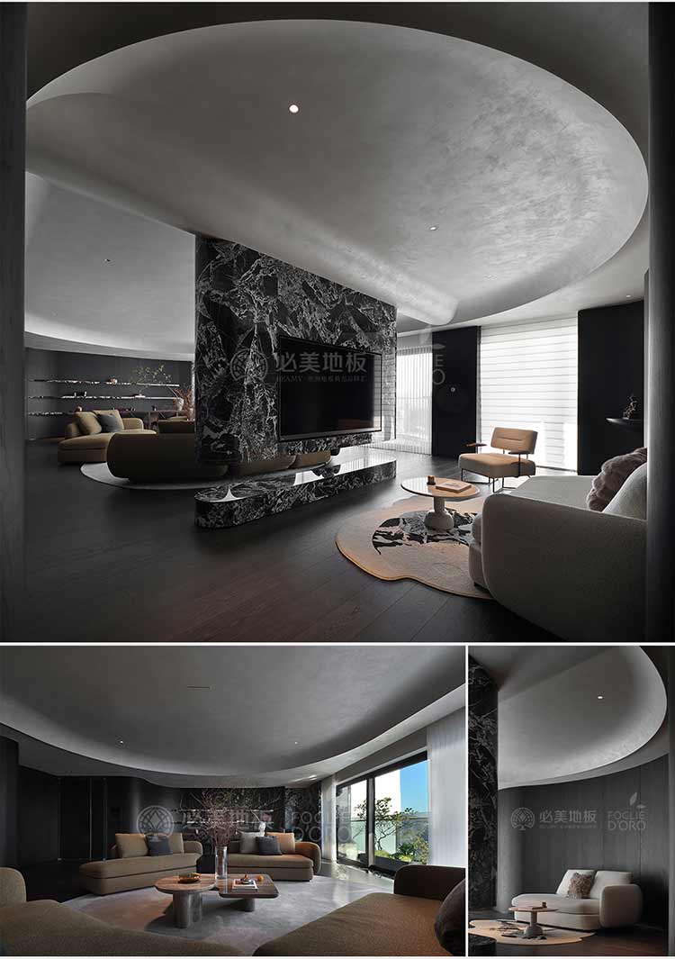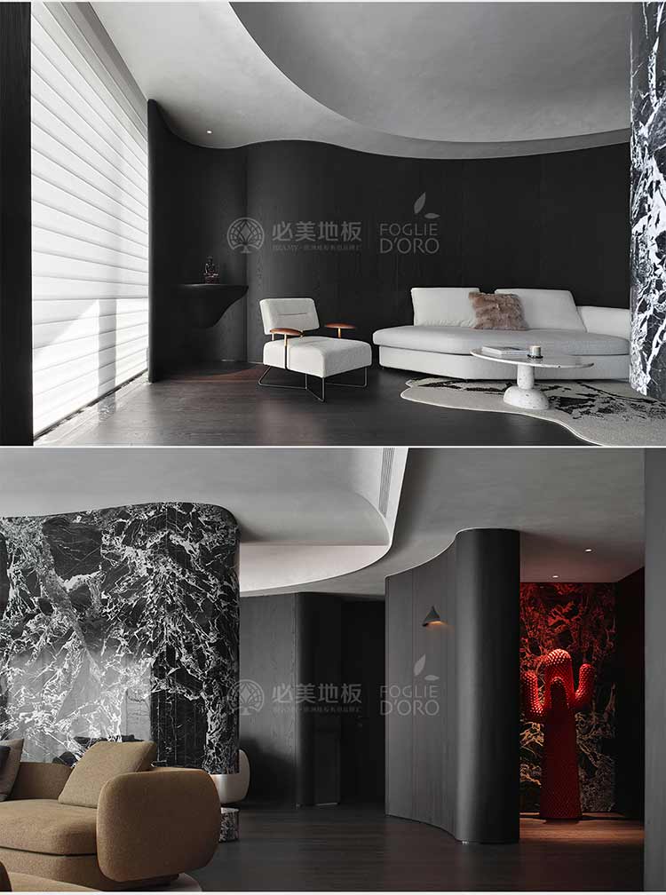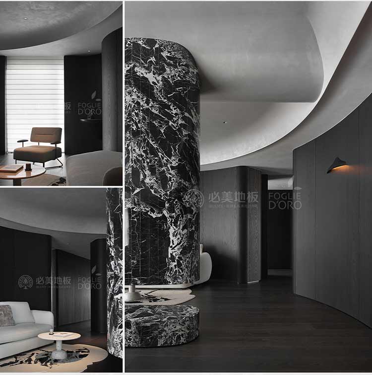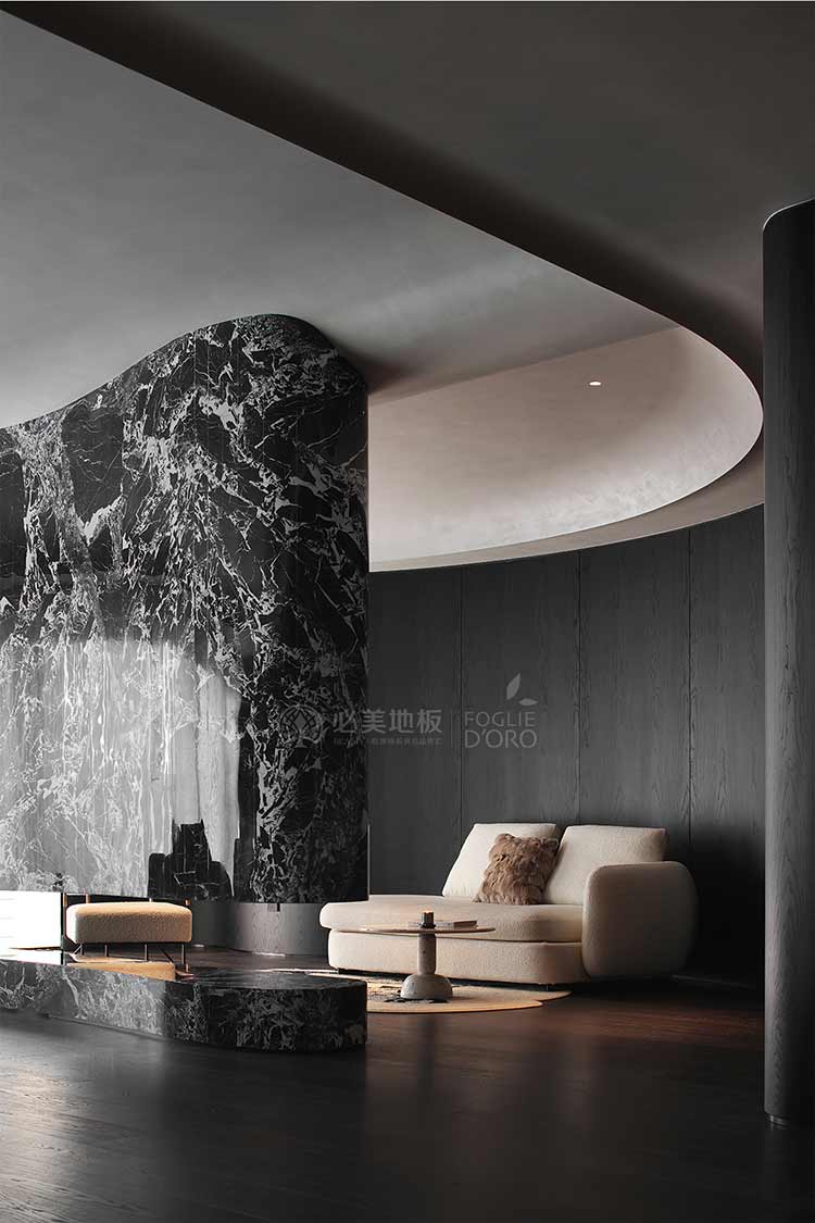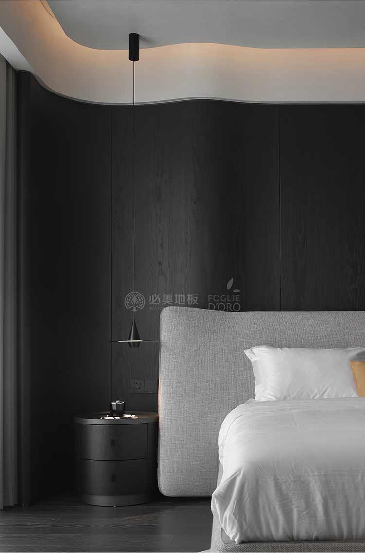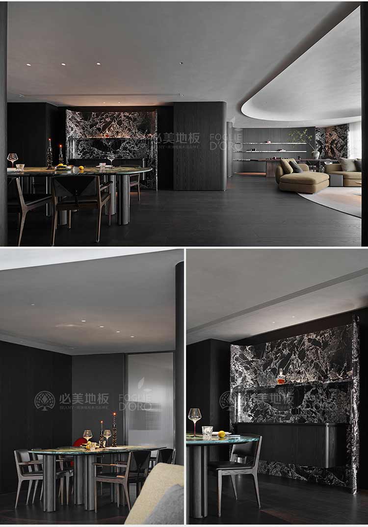 整個空間的視覺調(diào)性偏深邃的質(zhì)感暗調(diào),從軟裝、墻面家具陳設(shè)到地板,視覺達到了極度的高頻統(tǒng)一。必美菲列德羅皮薩尼橡木地板是通過手工雕刻、清漆染色,增加了木材的自然特性,讓空間通過光與材質(zhì)肌理的關(guān)系,明暗色彩的有效點綴,藝術(shù)家具化的主調(diào)形式,表達出空間的和諧與純粹感。