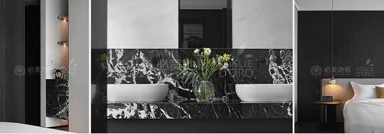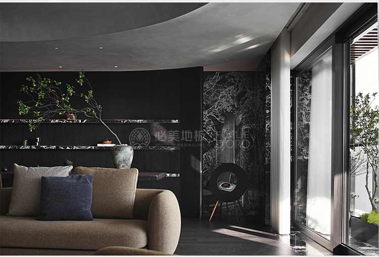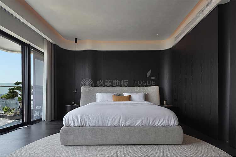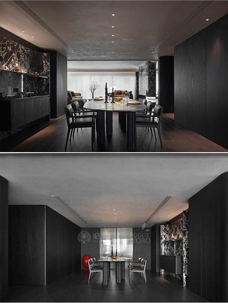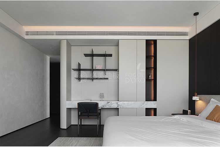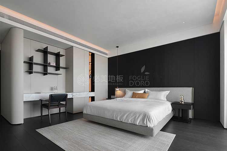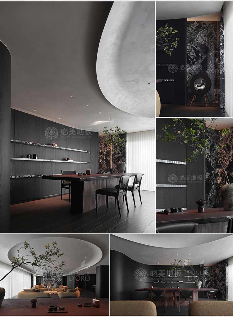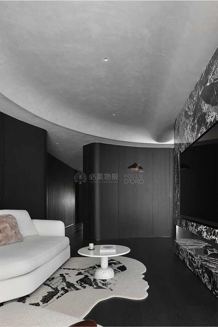 整個空間的視覺調(diào)性偏深邃的質(zhì)感暗調(diào),從軟裝、墻面家具陳設(shè)到地板,視覺達到了極度的高頻統(tǒng)一。必美菲列德羅皮薩尼橡木地板是通過手工雕刻、清漆染色,增加了木材的自然特性,讓空間通過光與材質(zhì)肌理的關(guān)系,明暗色彩的有效點綴,藝術(shù)家具化的主調(diào)形式,表達出空間的和諧與純粹感。