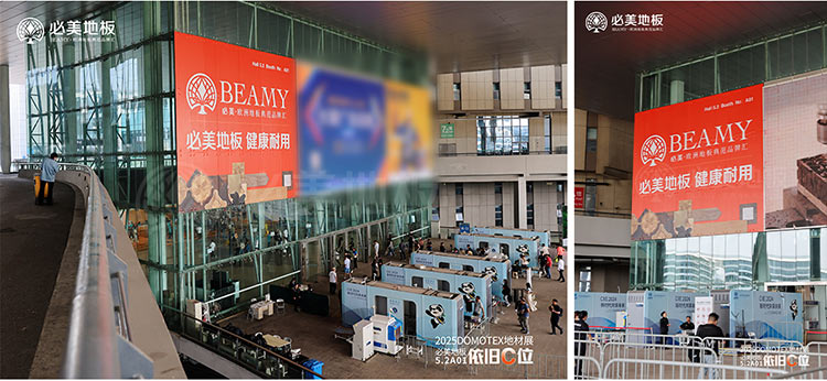 必美地板今年的出場方式格外引人注目,堪稱豪橫!在南大廳的觀眾入口處,必美外場廣告占據(jù)了最核心的C位,彰顯著品牌影響力。巨大的廣告牌在眾多品牌中脫穎而出,吸引著每一位過往觀眾的目光。