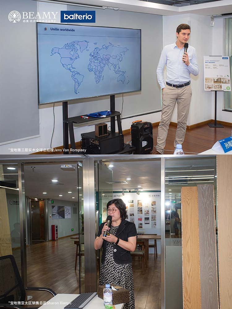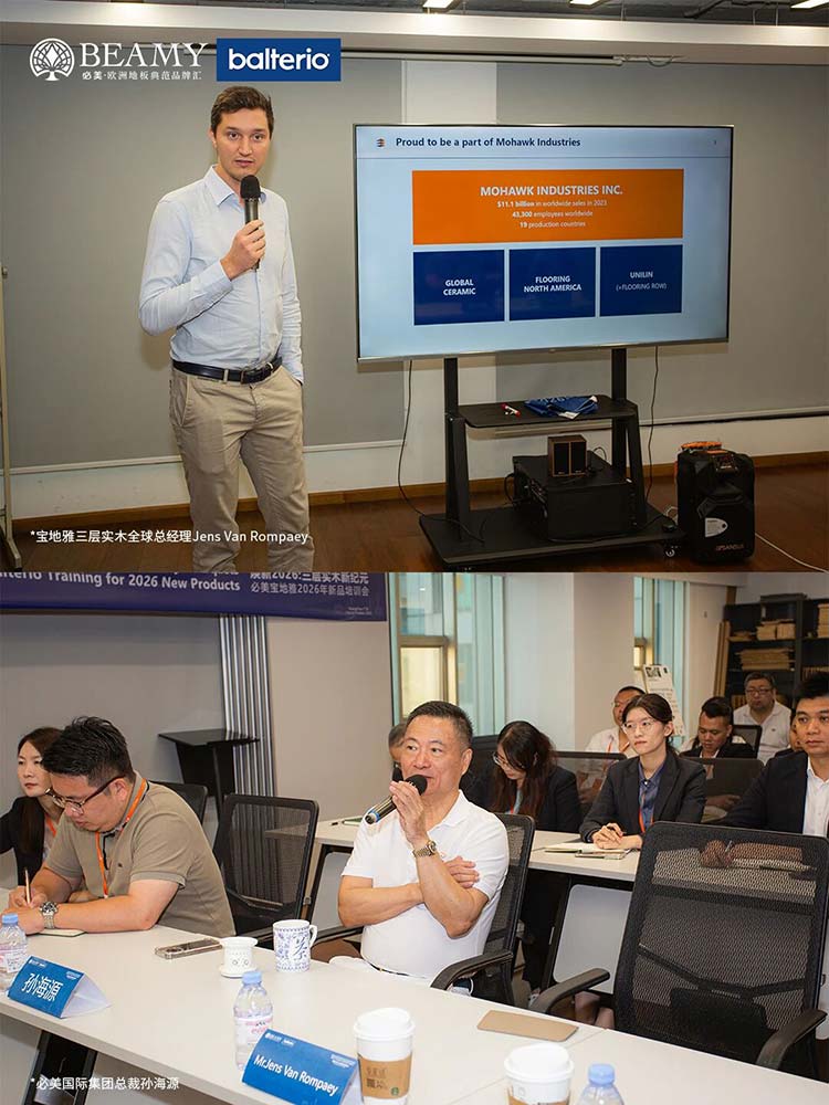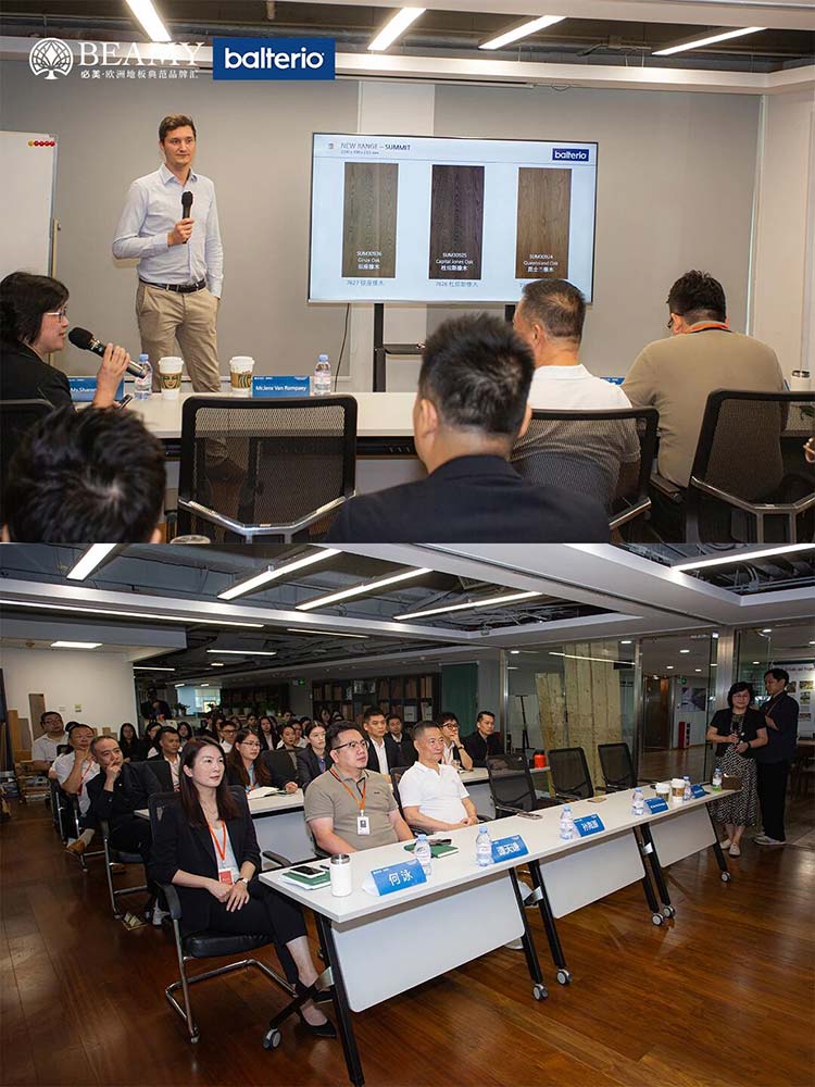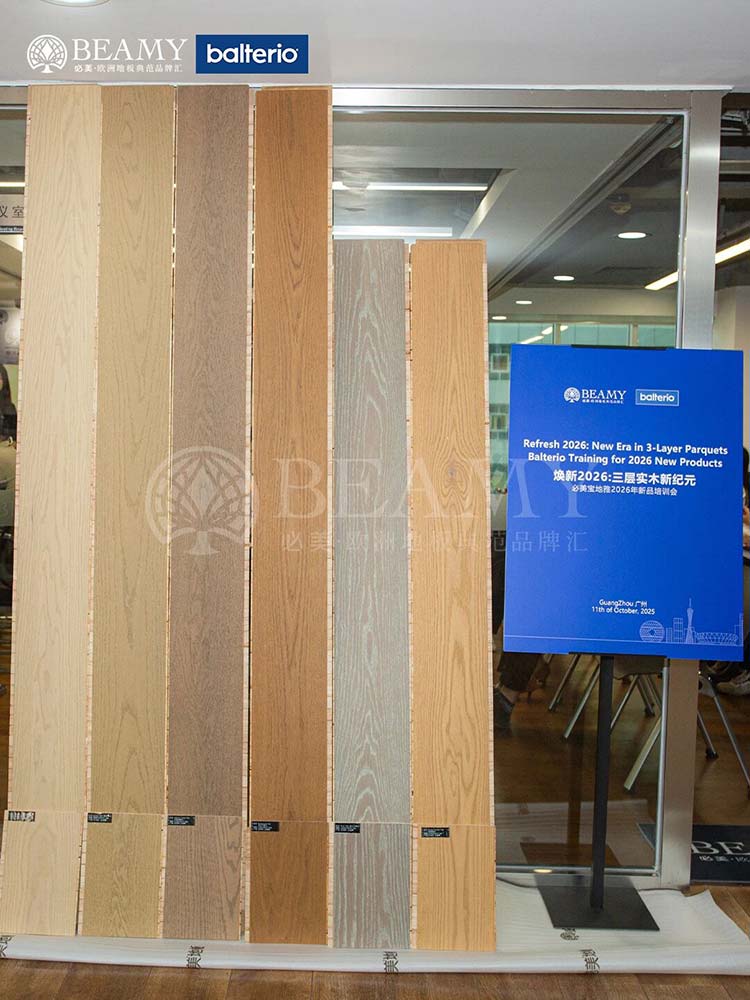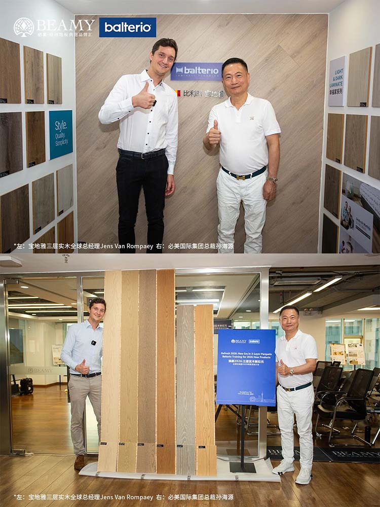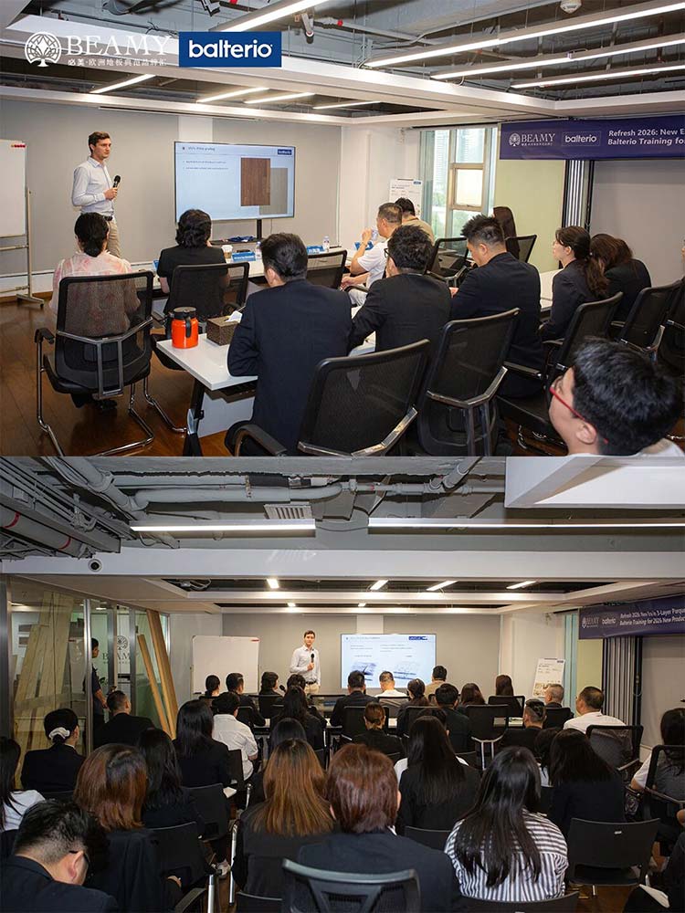 此次寶地雅中國(guó)之行,遠(yuǎn)不止于參觀交流。雙方就未來(lái)產(chǎn)品趨勢(shì)、健康家居生活體驗(yàn)升級(jí)等關(guān)鍵議題,進(jìn)行了全面而深入的探討。訪問(wèn)次日,一場(chǎng)以“煥新2026:三層實(shí)木新紀(jì)元”為主題的寶地雅2026新品培訓(xùn)會(huì)在必美集團(tuán)總部隆重舉行。這場(chǎng)前瞻性的新品品鑒與培訓(xùn)會(huì),全球范圍內(nèi)首次提前揭開(kāi)了寶地雅未來(lái)在三層實(shí)木地板產(chǎn)品技術(shù)革新與設(shè)計(jì)風(fēng)尚的神秘面紗,更為雙方后續(xù)的市場(chǎng)推廣奠定了堅(jiān)實(shí)的基礎(chǔ)。