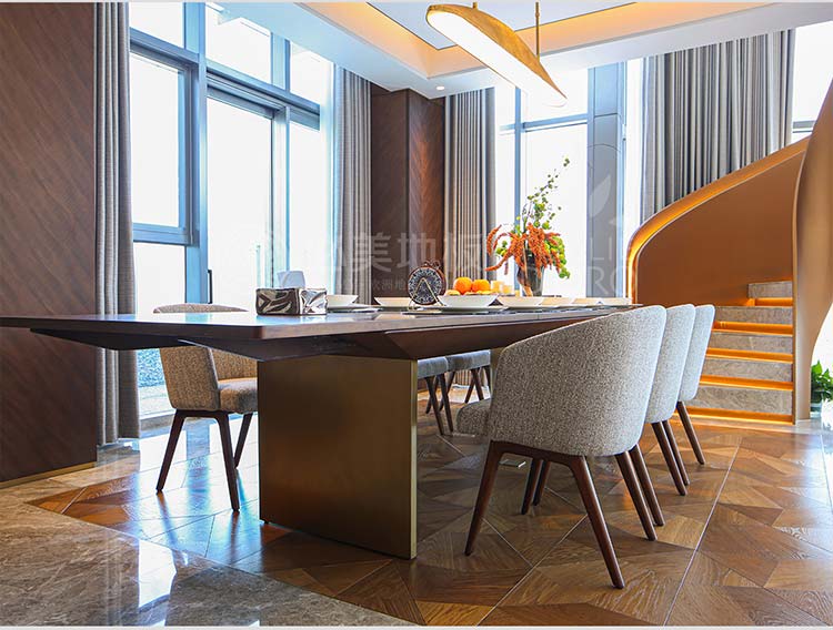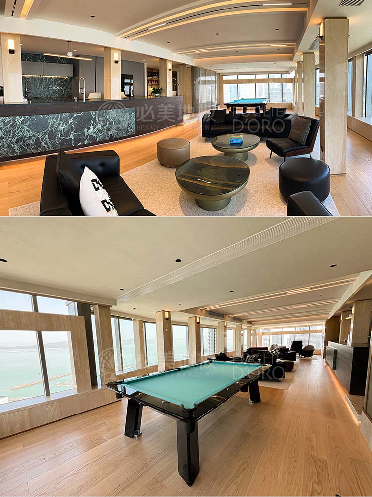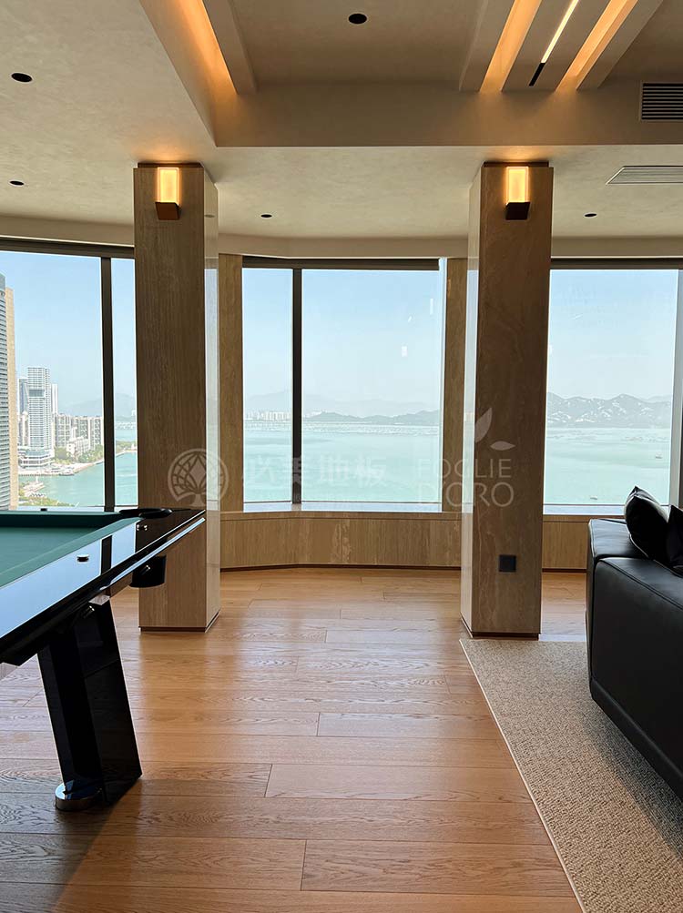 從旋轉樓梯的藝術焦點,到餐客廳弗拉門蒂拼花的幾何動態節奏;從茶室碧昂佳橡木的溫潤禪意,到次臥巴薩諾直板的寧靜舒適;從主臥巴塞吉奧橡木的尊貴沉穩,再到私人會所巴薩諾直板的活力溫吞……在這座深圳灣頂奢復式別墅中,每一塊必美地板都絕非簡單的地面鋪裝,而是經過深思熟慮的空間靈魂塑造者。它們以不同的個性,共同譜寫出一曲關于自然、藝術、奢華與生活的和諧交響。