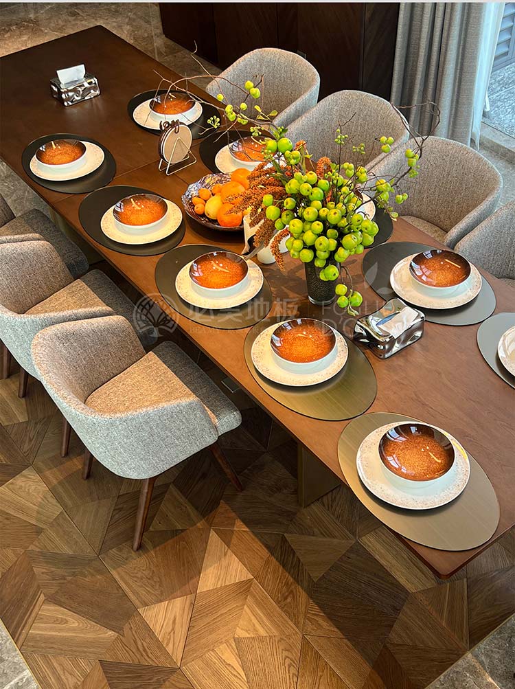 在餐廳區域地面鋪裝的選擇,是奠定整個空間氣質的關鍵。甄選了來自意大利必美菲列德羅Foglie d’Oro的弗拉門蒂拼花地板。