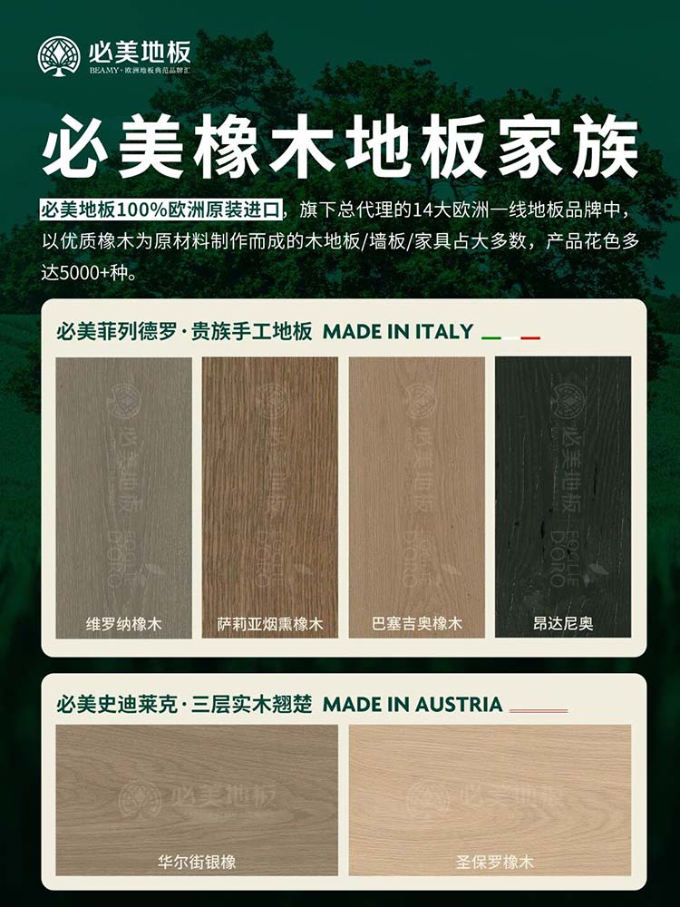 作為100%歐洲原裝進口地板品牌,必美地板旗下代理的14大歐洲一線地板品牌中,以優質橡木為原材料的產品,涵蓋木地板、墻板及家具等品類,花色選擇多達5000余種,滿足不同家居風格的需求。