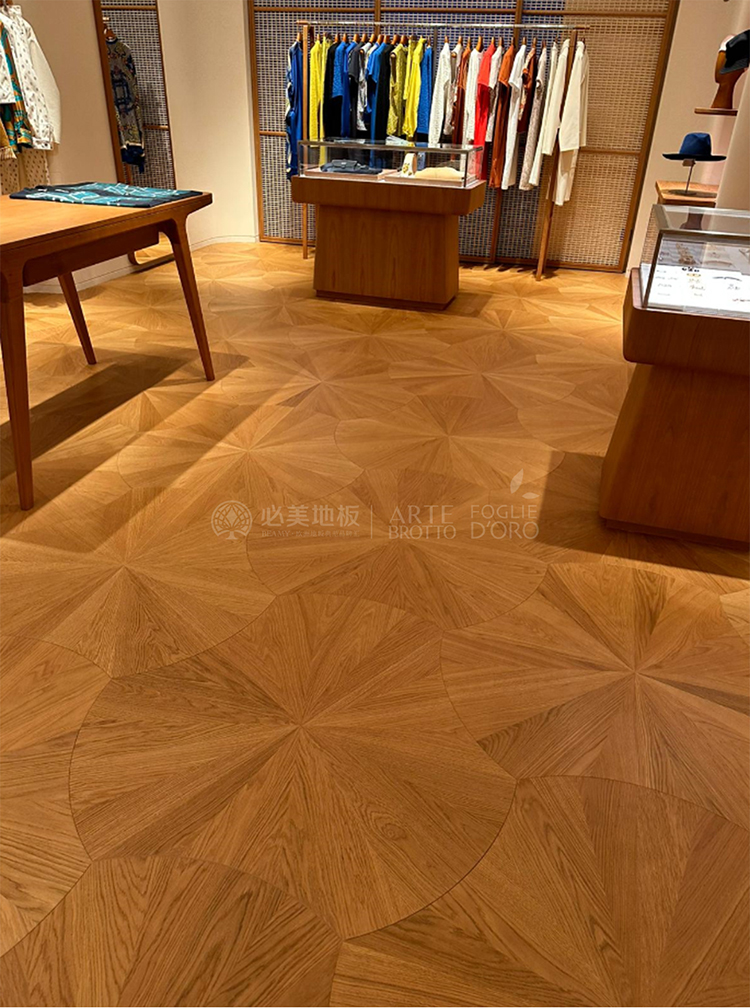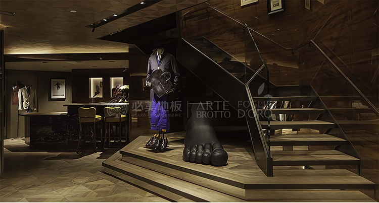 1000㎡ 印象拼花通鋪,選用百年橡木,質感深邃而溫潤;空間因此擁有了呼吸,高級感不言自明。