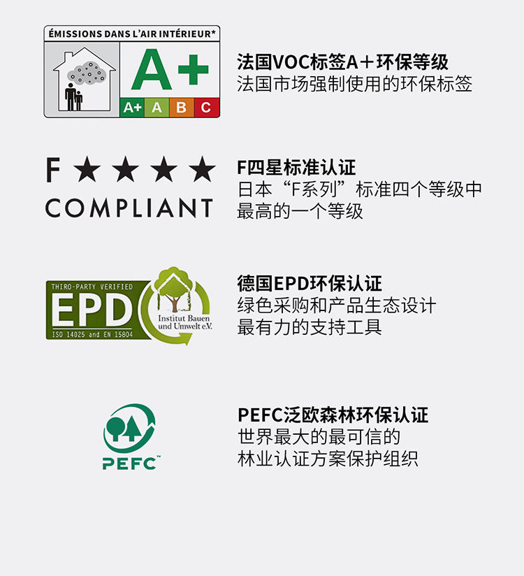 法國A+&日本F4星等多個環保認證,意味著家里有孕婦、有嬰兒、有老人,都可以放心。黑色底下,是安心的底色。