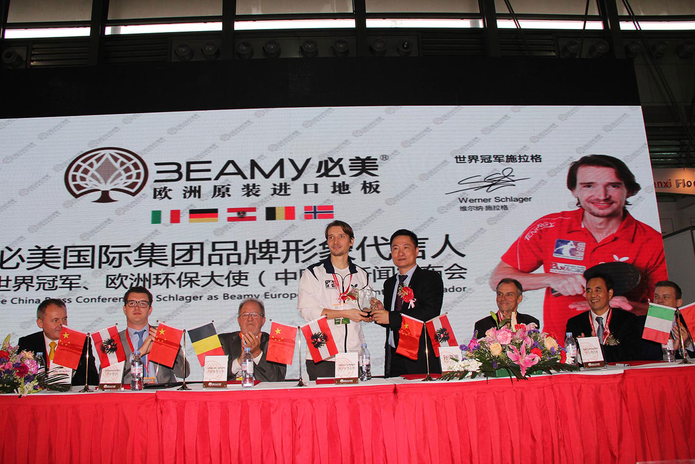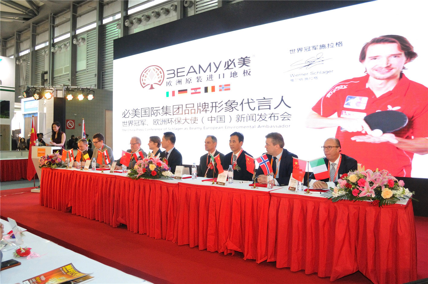 必美國際集團形象大使、乒乓球世界冠軍——Werner Schlager(維爾納.施拉格)先生、中國林產工業協會重要領導、必美國際高層、歐洲木地板工業協會(FEP)終身常任理事、歐洲木地板工業協會前任主席、 史迪萊克木業集團董事長——Karl Scheucher、必美國際集團旗下的德國、意大利、奧地利、挪威、比利時歐洲工廠代表親臨現場,發表精彩講話,共同見證歷史性的時刻。